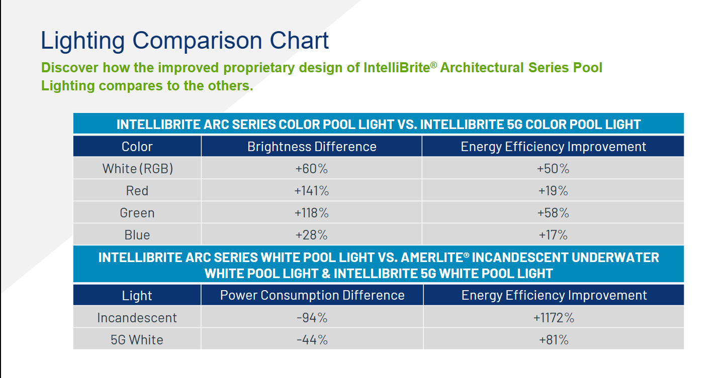 *Compared to Pentair IntelliBrite 5G Color LED Pool Light in white color mode only. The IntelliBrite Architectural Series delivers higher lumen output depending on color mode, ranging from 28-141% brighter, while energy efficiency improvements range from 17-58% based on color mode.